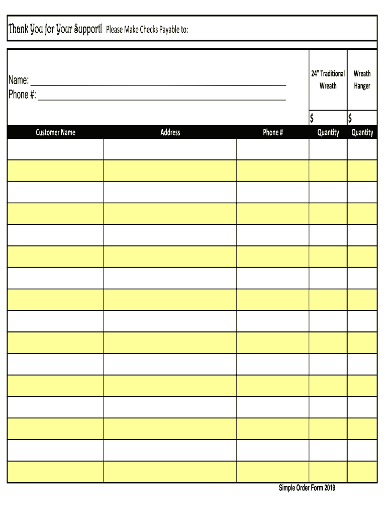 Thank You for Your Support! Please Make Checks Payable to:Name: Phone #: 24 Traditional Wreath Customer NameAddressPhone #Wreath Hanger QuantitySimple Order Form 2019Quantity