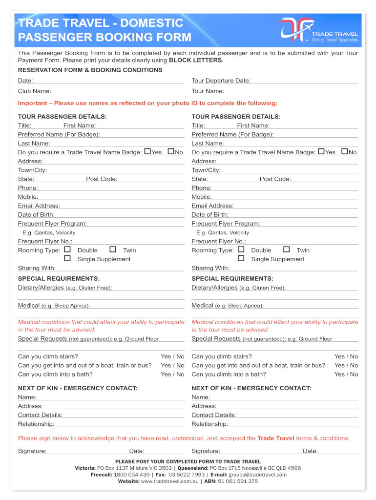 TRADE TRAVEL DOMESTIC PASSENGER BOOKING From This Passenger Booking Form is to be completed by each individual passenger and is to be submitted with your Tour Payment Form. Please print your details