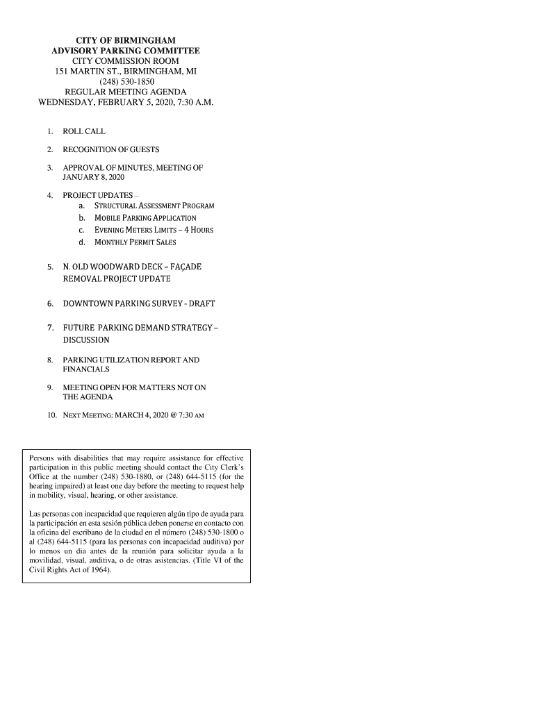 CITY OF BIRMINGHAM ADVISORY PARKING COMMITTEE CITY COMMISSION ROOM 151 MARTIN ST., BIRMINGHAM, MI (248) 5301850 REGULAR MEETING AGENDA WEDNESDAY, FEBRUARY 5, 2020, 7:30 A.M. 1.ROLL CALL2.RECOGNITION