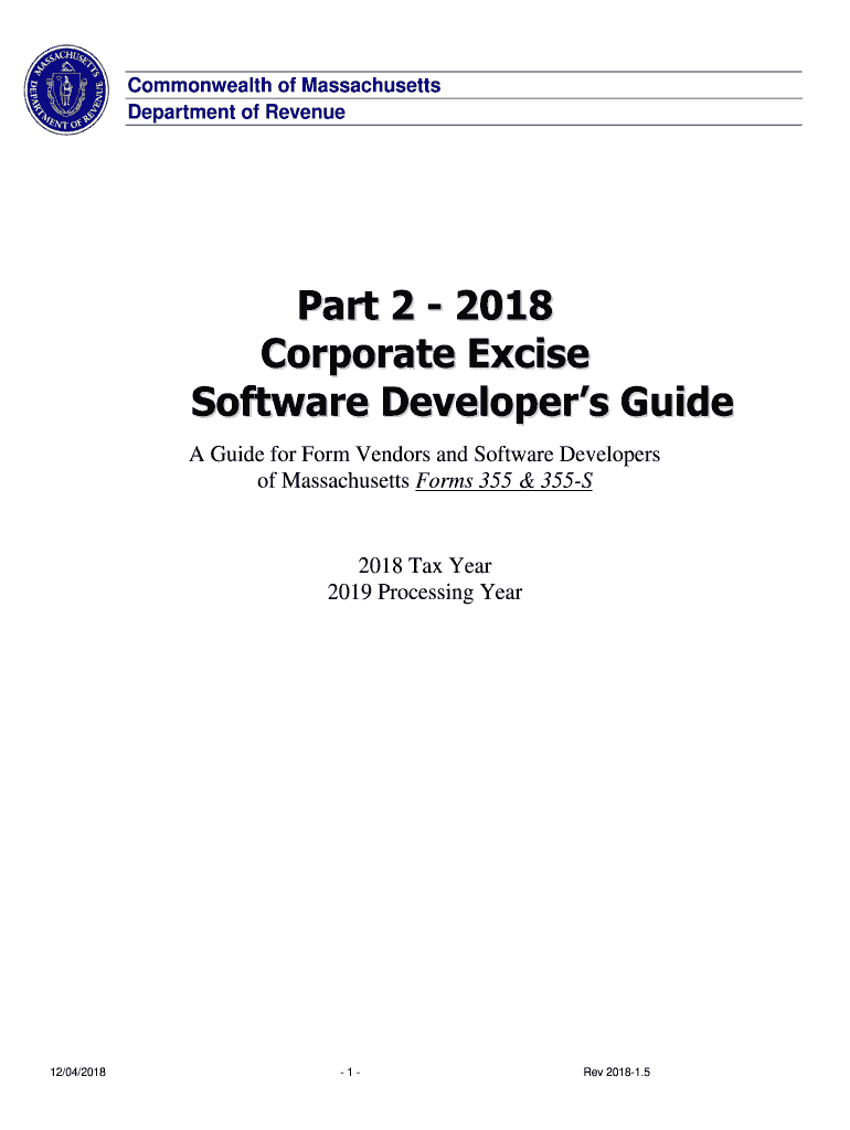 Commonwealth of Massachusetts Department of Revenuers 2 2018 Corporate Excise Software Developers Guide A Guide for Form Vendors and Software Developers of Massachusetts Forms 355 & 355S2018 Tax Year