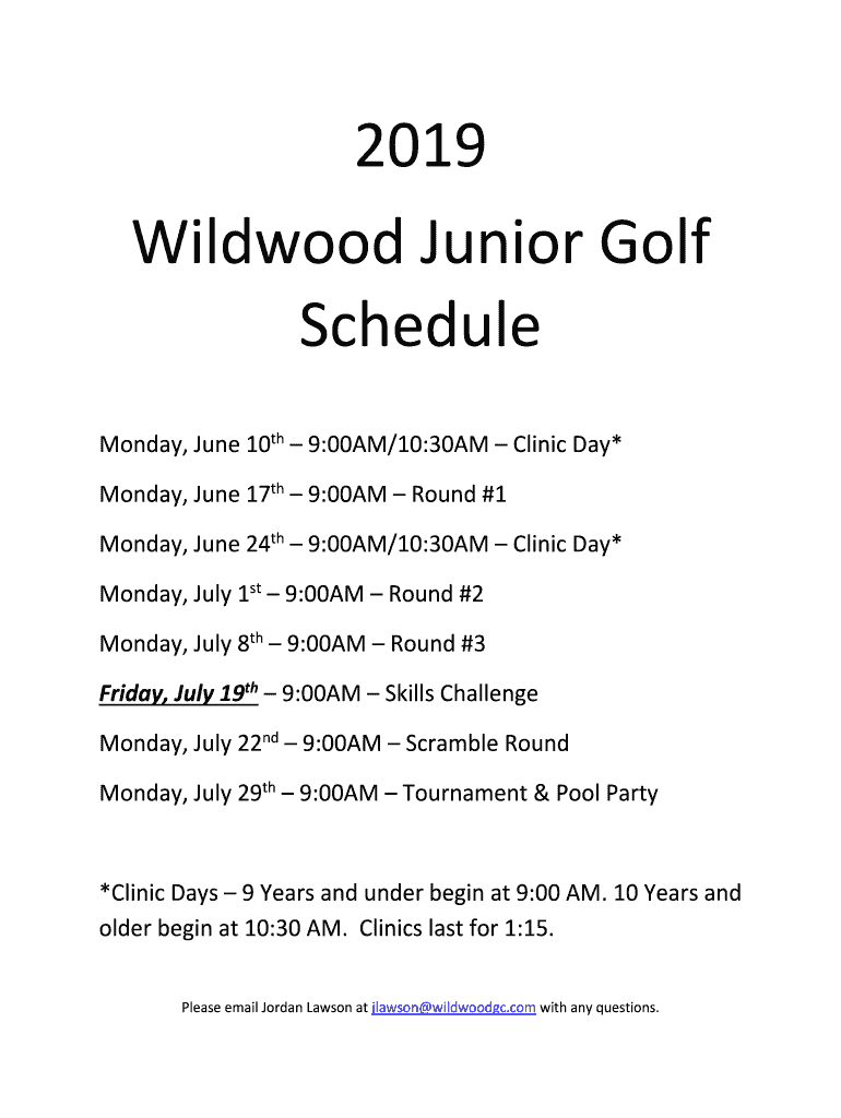 2019 Wildwood Junior Golf Schedule Monday, June 10th 9:00AM/10:30AM Clinic Day* Monday, June 17th 9:00AM Round #1 Monday, June 24th 9:00AM/10:30AM Clinic Day* Monday, July 1st 9:00AM Round #2 Monday,