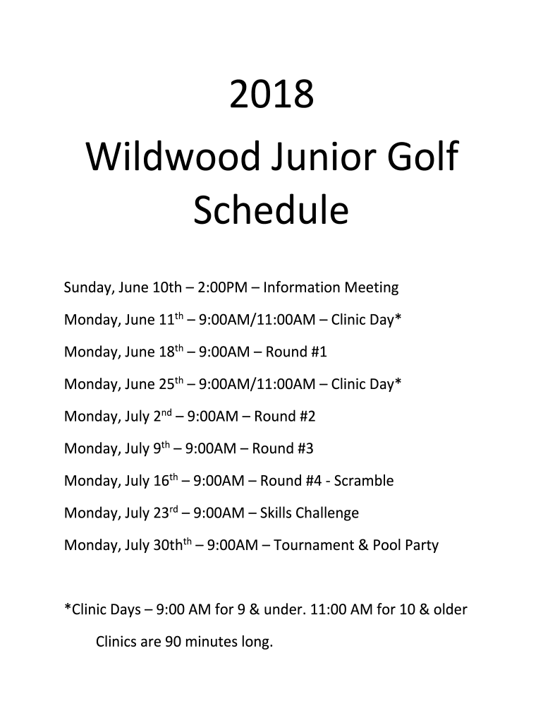 2018 Wildwood Junior Golf Schedule Sunday, June 10th 2:00PM Information Meeting Monday, June 11th 9:00AM/11:00AM Clinic Day* Monday, June 18th 9:00AM Round #1 Monday, June 25th 9:00AM/11:00AM Clinic