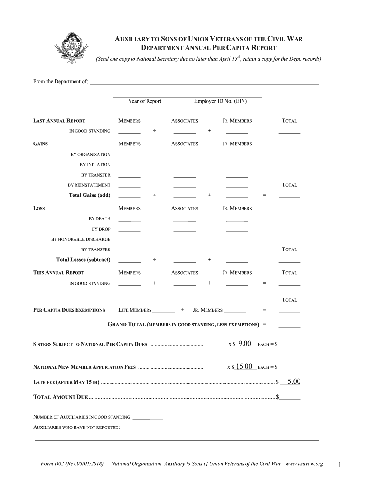 AUXILIARY TO SONS OF UNION VETERANS OF THE CIVIL WAR DEPARTMENT ANNUAL PER CAPITA REPORT(Send one copy to National Secretary due no later than April 15th, retain a copy for the Dept. records)From