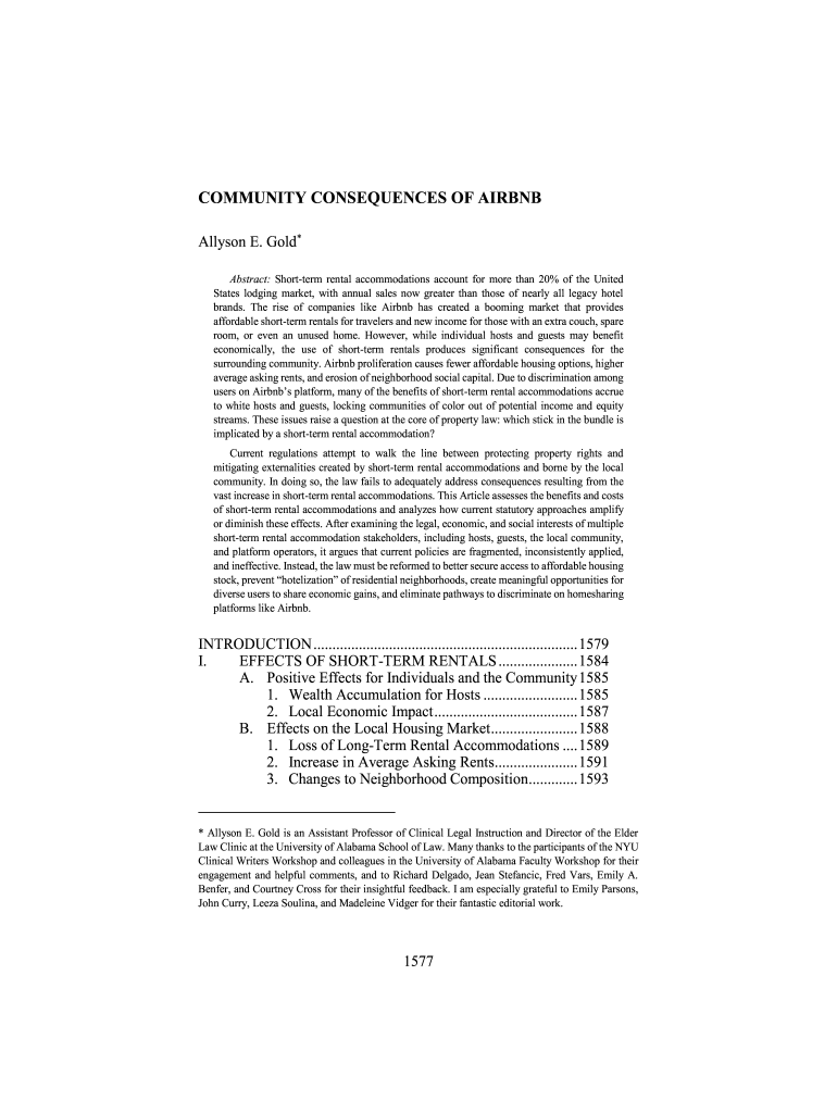 06 Gold.docx (Do Not Delete)12/20/2019 10:47 COMMUNITY CONSEQUENCES OF AIRBNB Allyson E. Gold* Abstract: Short term rental accommodations account for more than 20% of the United States lodging market,