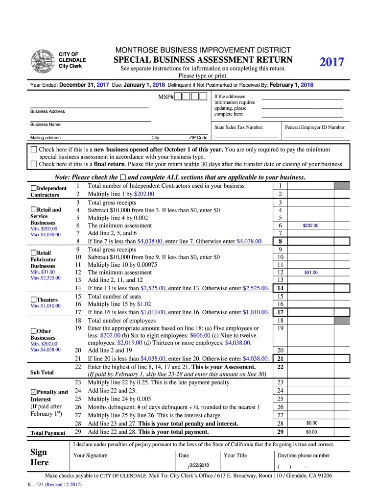 MONTROSE BUSINESS IMPROVEMENT DISTRICTCITY OF GLENDALE City ClerkSPECIAL BUSINESS ASSESSMENT RETURN2017See separate instructions for information on completing this return. Please type or print. Year
