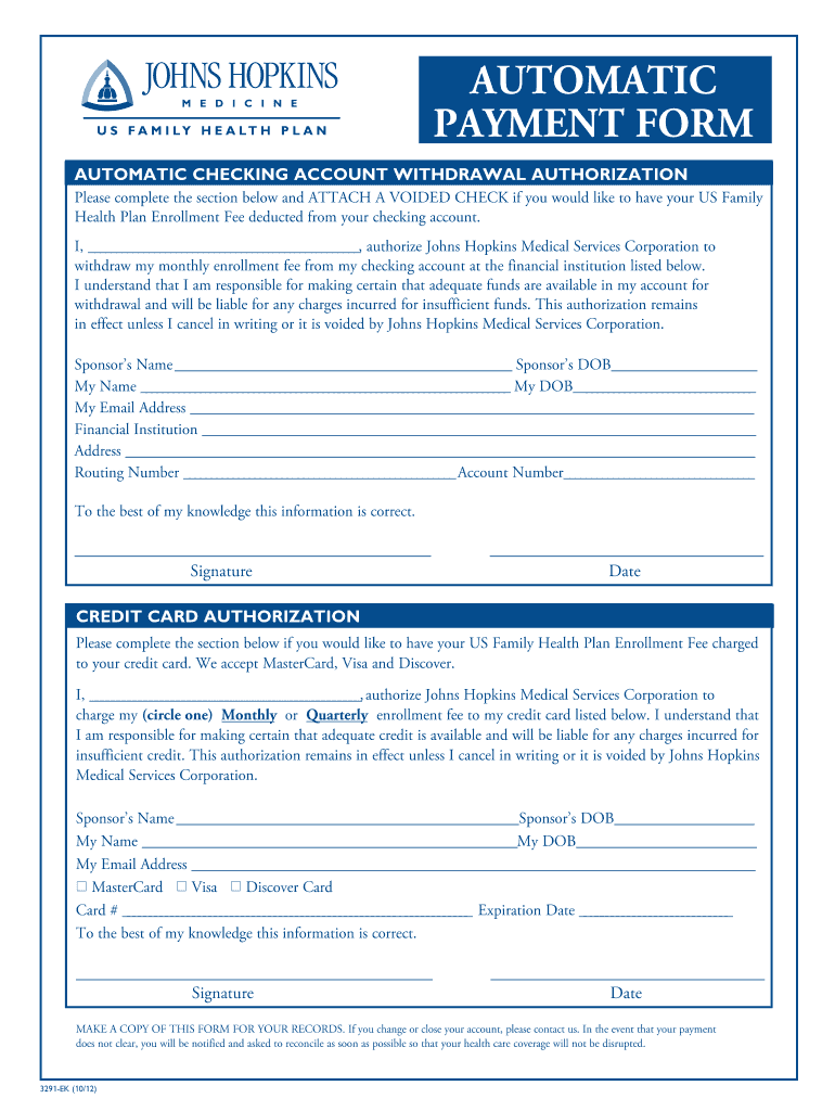 AUTOMATIC PAYMENT FORM AUTOMATIC CHECKING ACCOUNT WITHDRAWAL AUTHORIZATION Please complete the section below and ATTACH A VOIDED CHECK if you would like to have your US Family Health Plan Enrollment