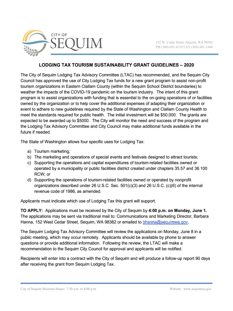 152 W. Cedar Street, Sequin, WA 98382 PH (360) 6834139 FAX (360) 6813448LODGING TAX TOURISM SUSTAINABILITY GRANT GUIDELINES 2020 The City of Sequin Lodging Tax Advisory Committee (LTAC) has recommended,