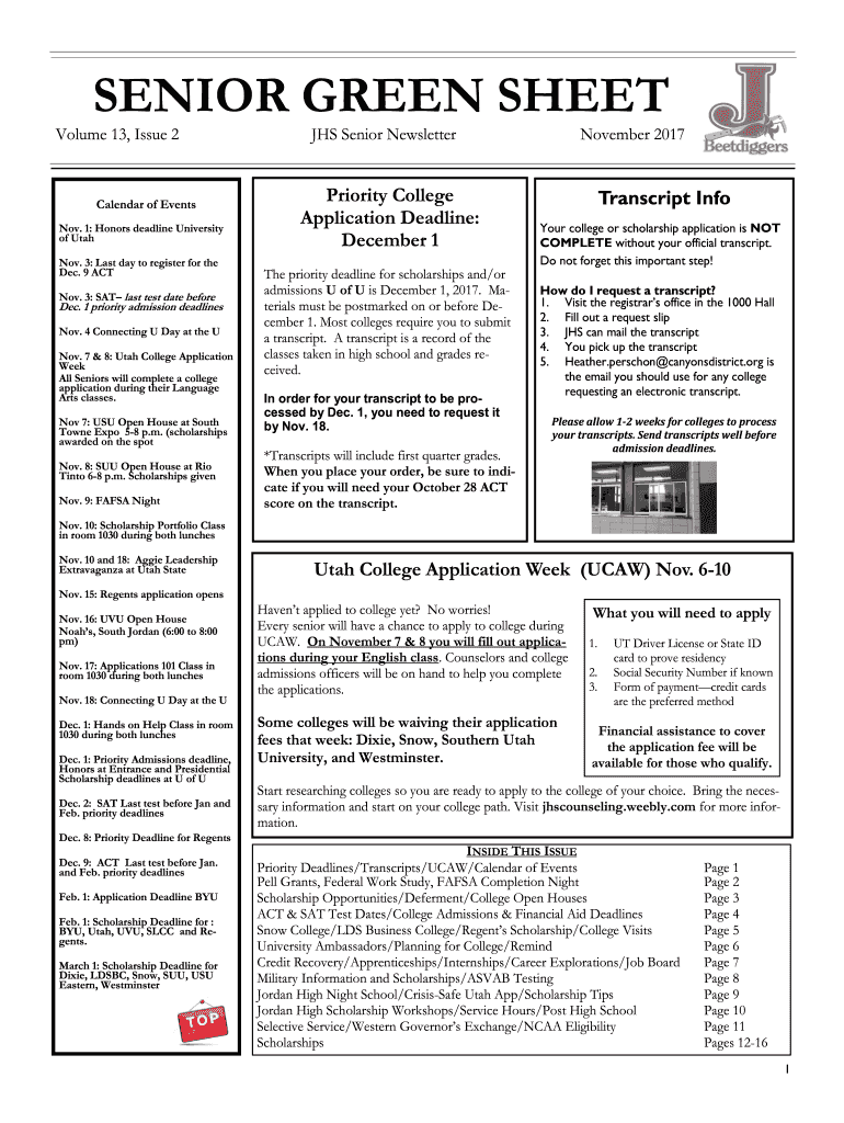 SENIOR GREEN SHEET Volume 13, Issue 2Calendar of Events Nov. 1: Honors deadline University of Utah Nov. 3: Last day to register for the Dec. 9 ACT Nov. 3: SAT last test date before Dec. 1 priority