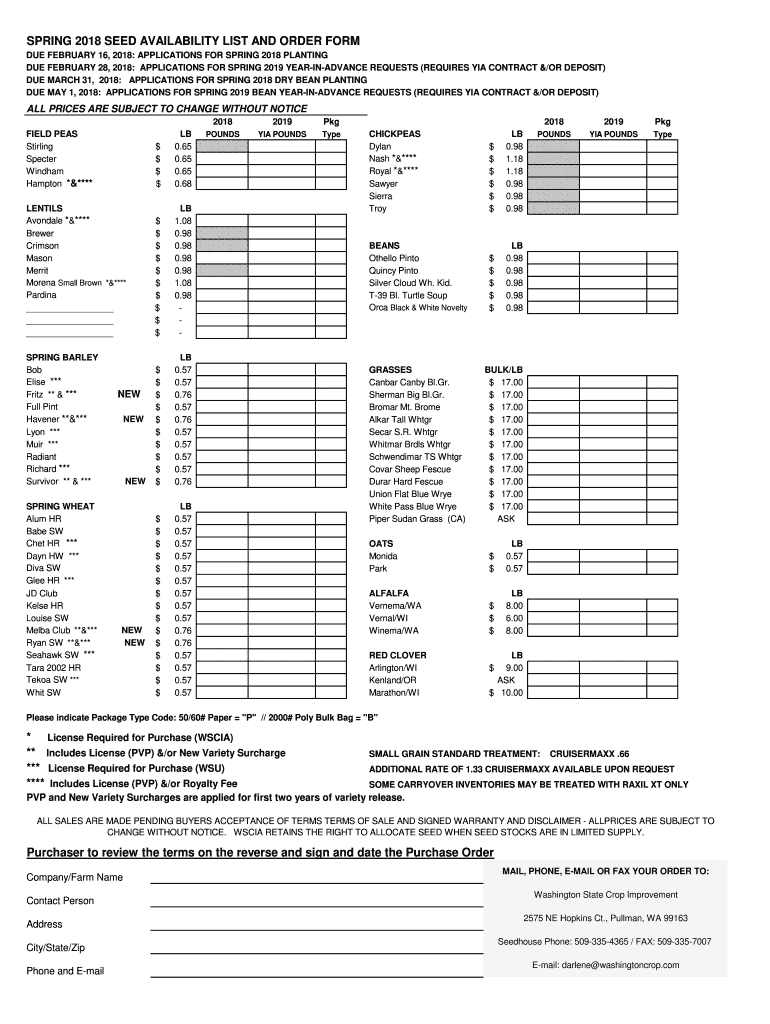 SPRING 2018 SEED AVAILABILITY LIST AND ORDER FORM DUE FEBRUARY 16, 2018: APPLICATIONS FOR SPRING 2018 PLANTING DUE FEBRUARY 28, 2018: APPLICATIONS FOR SPRING 2019 YEARINADVANCE REQUESTS (REQUIRES
