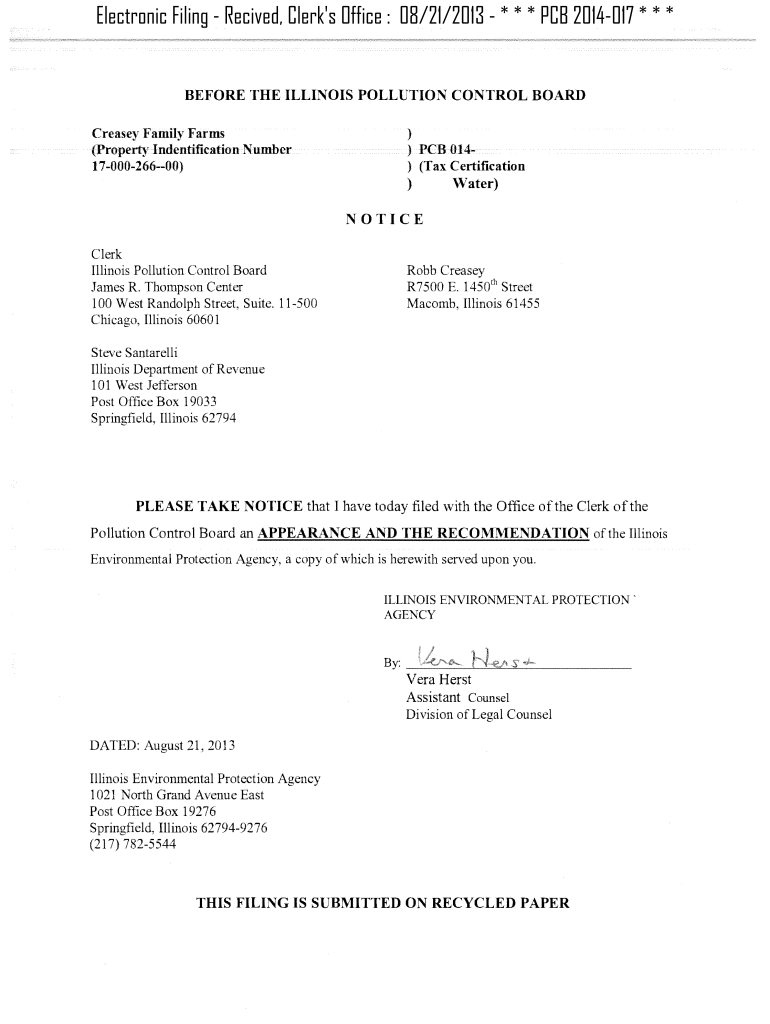 Electronic Filing Received, Clerk's Office : 08/21/2013 * * * PCB 2014017 * * *BEFORE THE ILLINOIS POLLUTION CONTROL BOARD Crease Family Farms (Property Identification Number 1700026600))) PCB 014)