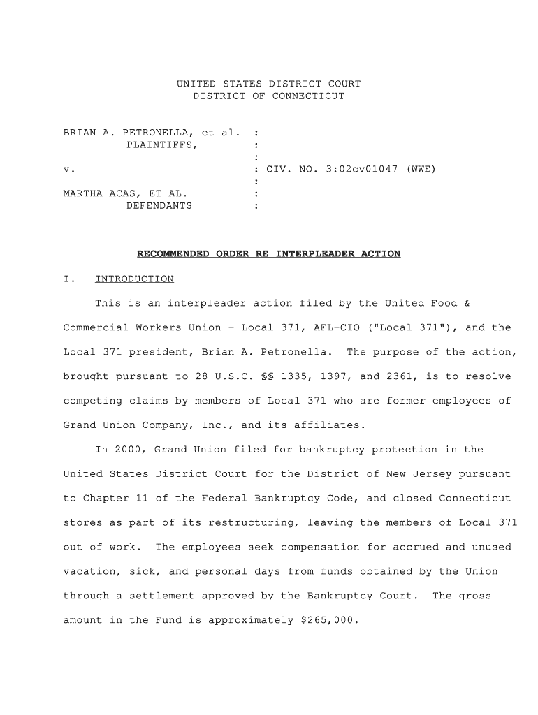 UNITED STATES DISTRICT COURT DISTRICT OF CONNECTICUTBRIAN A. PETRONELLI, et al. PLAINTIFFS, v. MARTHA ACAS, ET AL. DEFENDANTS: : : : CIV. NO. 3:02cv01047 (WWE) : : :RECOMMENDED ORDER RE INTERPLEADER