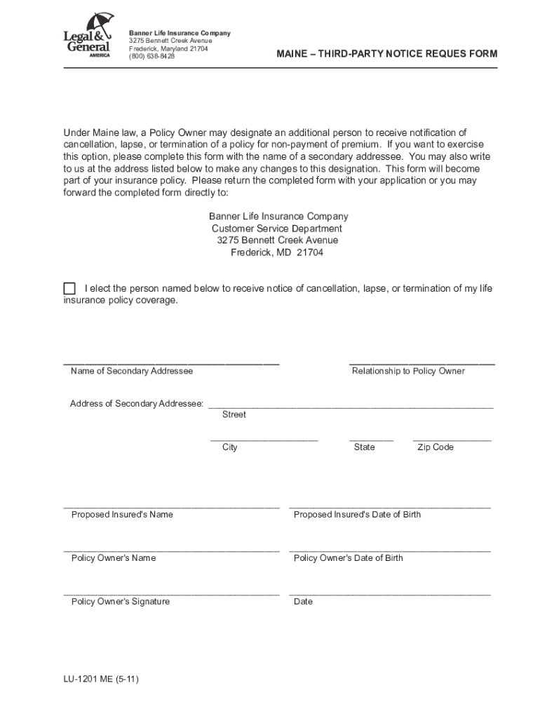 The form is available for use by any life insurance policy owner in Maine who wishes to designate a secondary addressee for important notifications regarding their policy.