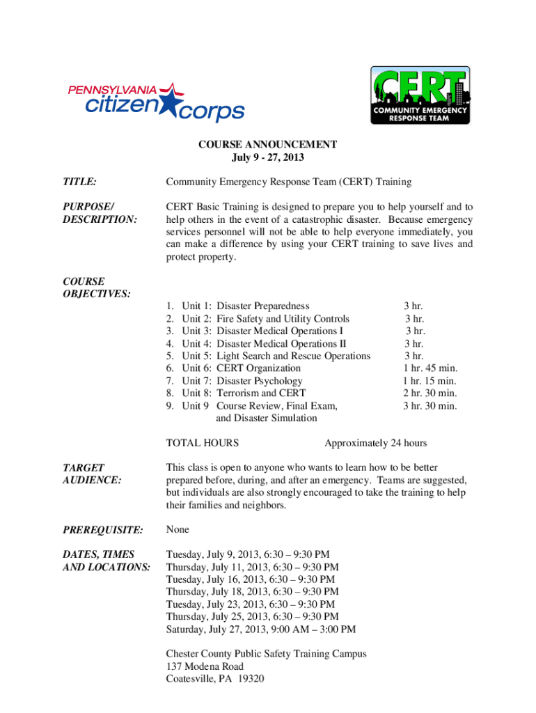 COURSE ANNOUNCEMENT July 9 27, 2013 TITLE:Community Emergency Response Team (CERT) TrainingPURPOSE/ DESCRIPTION:CERT Basic Training is designed to prepare you to help yourself and to help others in