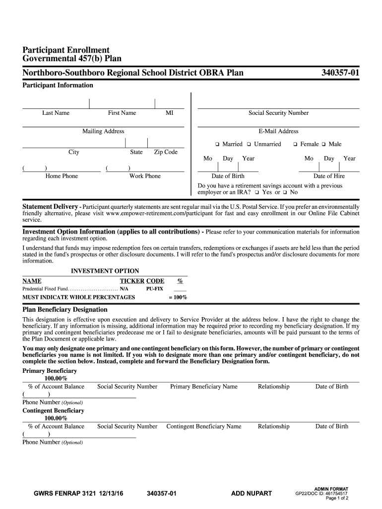 Participant Enrollment Governmental 457(b) Plan NorthboroSouthboro Regional School District BRA Plan34035701Participant Informational NameFirst Semisocial Security NumberMailing AddressEMail Address