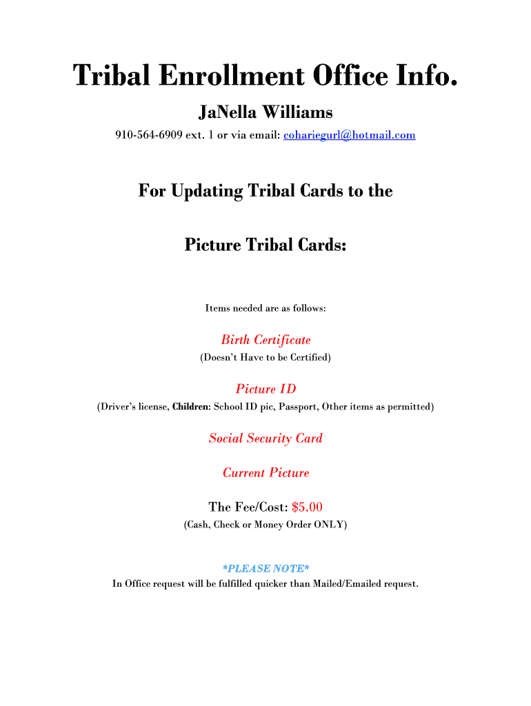 9105646909 ext. 1 or via email: cohariegurl@hotmail.comFor Updating Tribal Cards to the