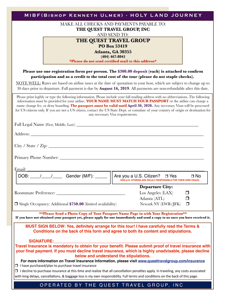 M I B F (B i s h o p K e n n e t h U l m e r) H O LY L A N D J O U R N E Y MAKE ALL CHECKS AND PAYMENTS PAYABLE TO: THE QUEST TRAVEL GROUP, INC AND SEND TO:THE QUEST TRAVEL GROUP PO Box 53419 Atlanta,