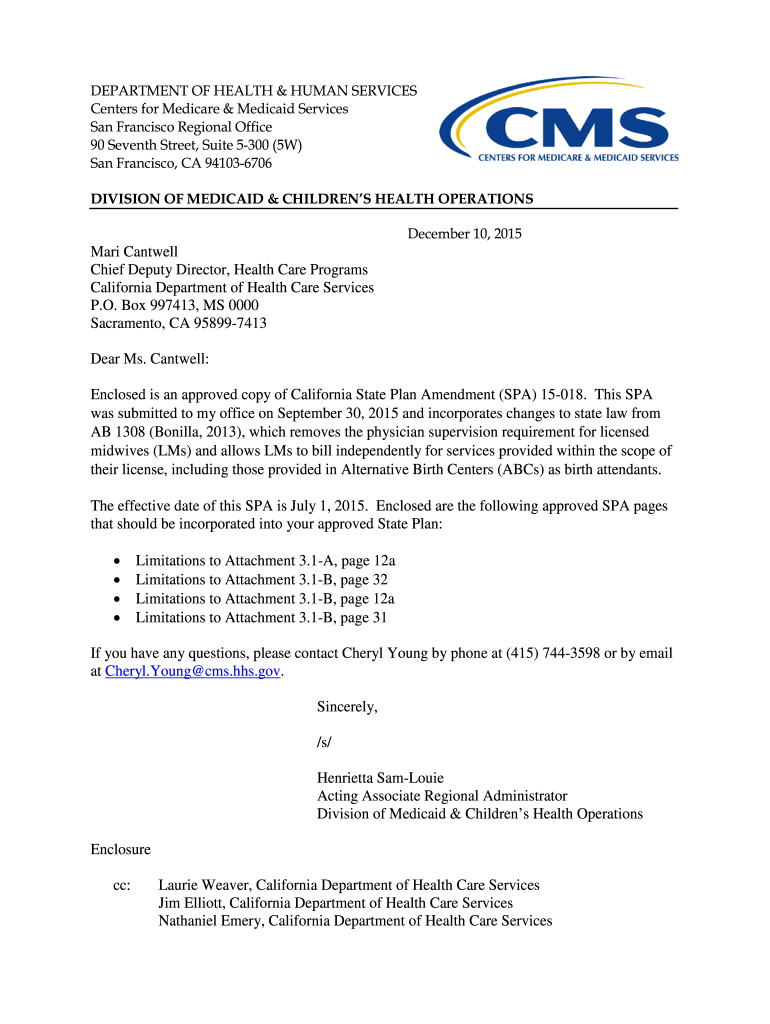 DEPARTMENT OF HEALTH & HUMAN SERVICES Centers for Medicare & Medicaid Services San Francisco Regional Office 90 Seventh Street, Suite 5300 (5W) San Francisco, CA 941036706 DIVISION OF MEDICAID & CHILDREN