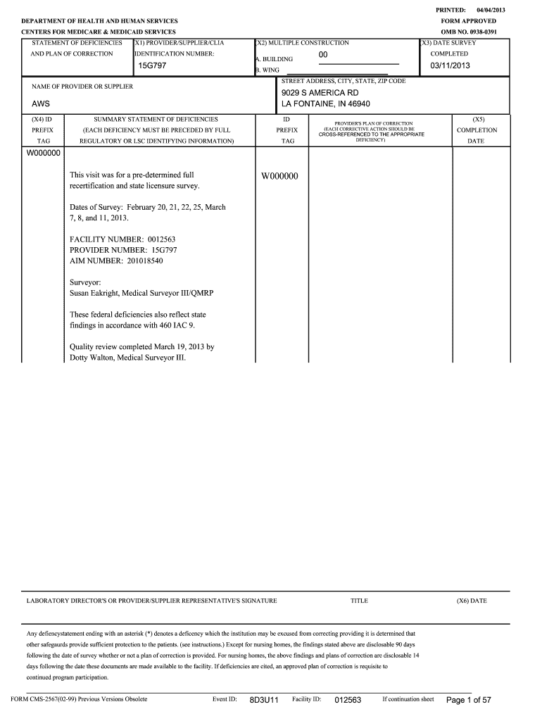 PRINTED: DEPARTMENT OF HEALTH AND HUMAN SERVICES CENTERS FOR MEDICARE & MEDICAID SERVICES STATEMENT OF DEFICIENCIES(X1) PROVIDER/SUPPLIER/LIGAND PLAN OF CORRECTIONIDENTIFICATION NUMBER:15G79704/04/2013FORM