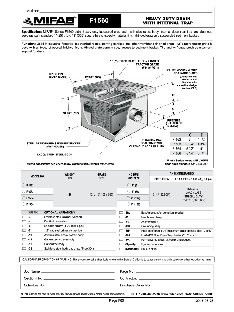 WITH INTERNAL TRAPF1560Specification: MI FAB Series F1560 extra heavy duty lacquered area drain with side outlet body, internal deep seal trap and clean out,