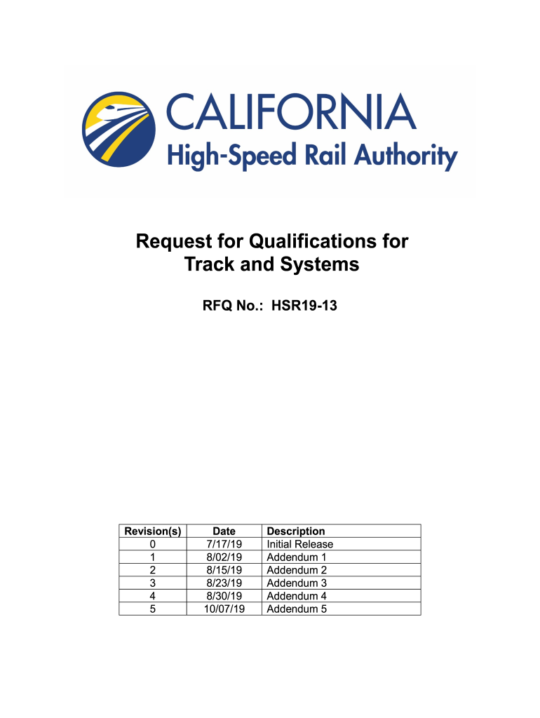 Request for Qualifications for Track and Systems RFQ No.: HSR1913Revision(s) 0 1 2 3 4 5Date 7/17/19 8/02/19 8/15/19 8/23/19 8/30/19 10/07/19Description Initial Release Addendum 1 Addendum 2 Addendum