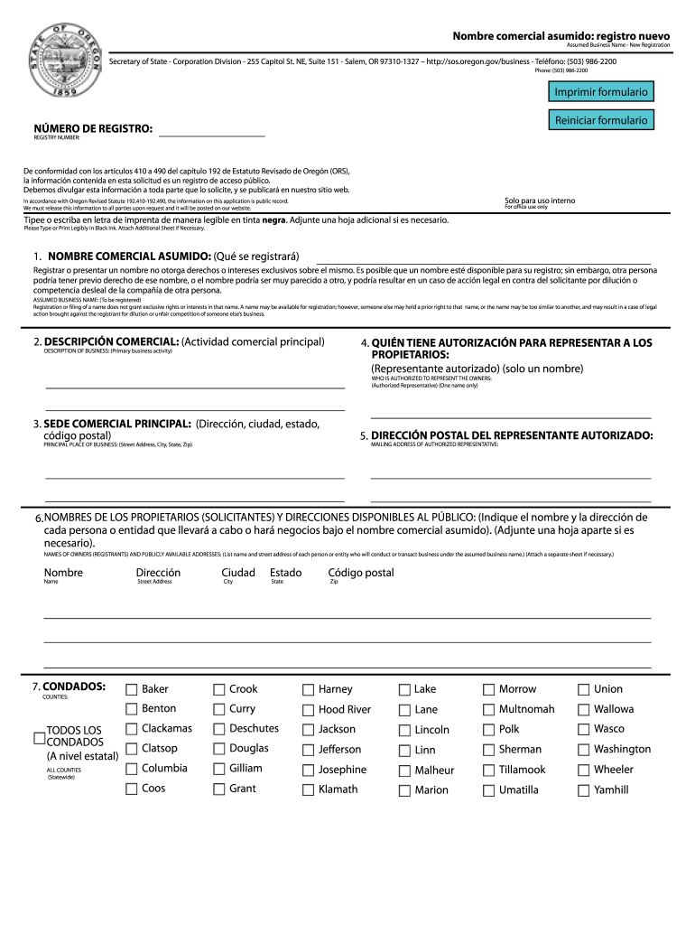 Hombre commercial assumed: registry Nero Assumed Business Name New Registration Secretary of State Corporation Division 255 Capitol St. NE, Suite 151 Salem, OR 973101327 http://sos.oregon.gov/business