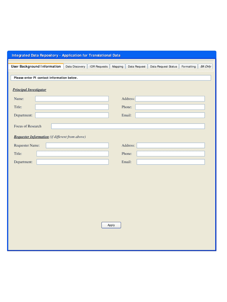 The Integrated Data Repository - Application for Translational Data is a form used by researchers to request access to clinical and demographic data for translational research purposes.