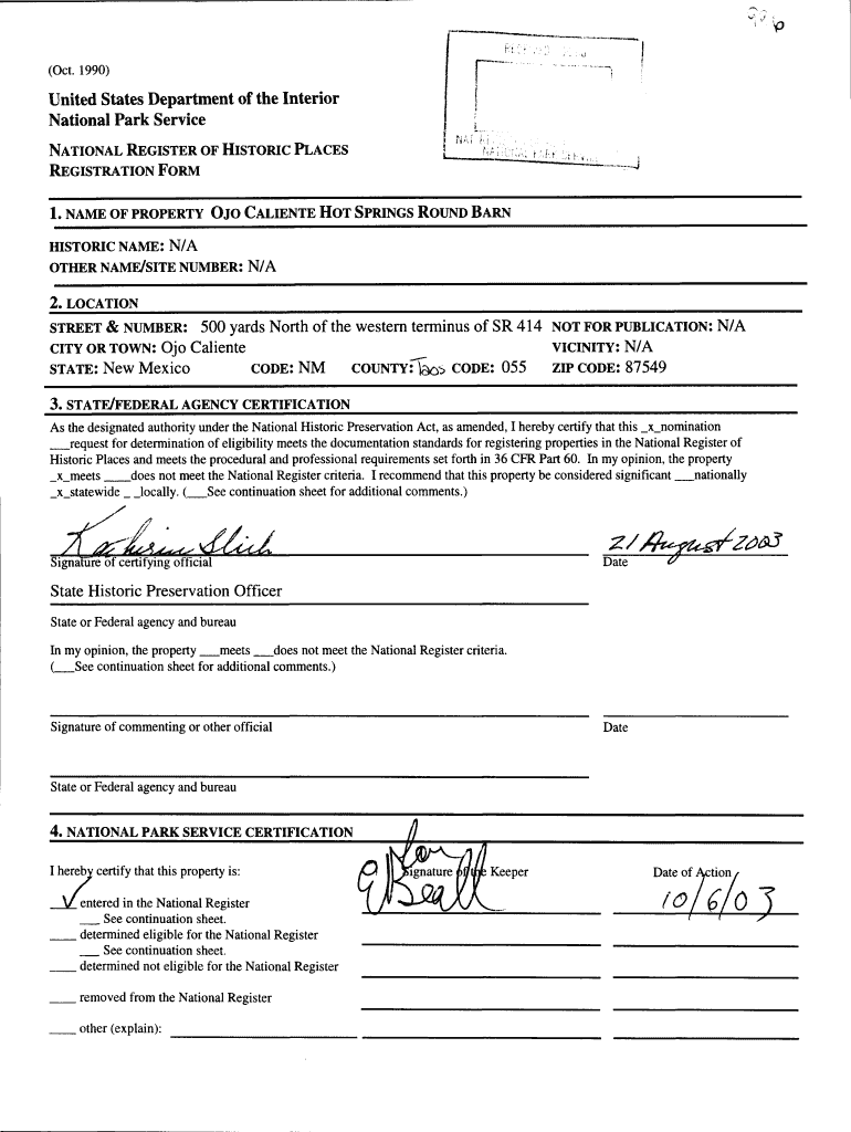 (Oct. 1990)United States Department of the Interior National Park ServiceNATIONAL REGISTER OF HISTORIC PLACES REGISTRATION FORM I. NAME OF PROPERTY Jo CLIENT HOT SPRINGS ROUND PREHISTORIC NAME: N/A