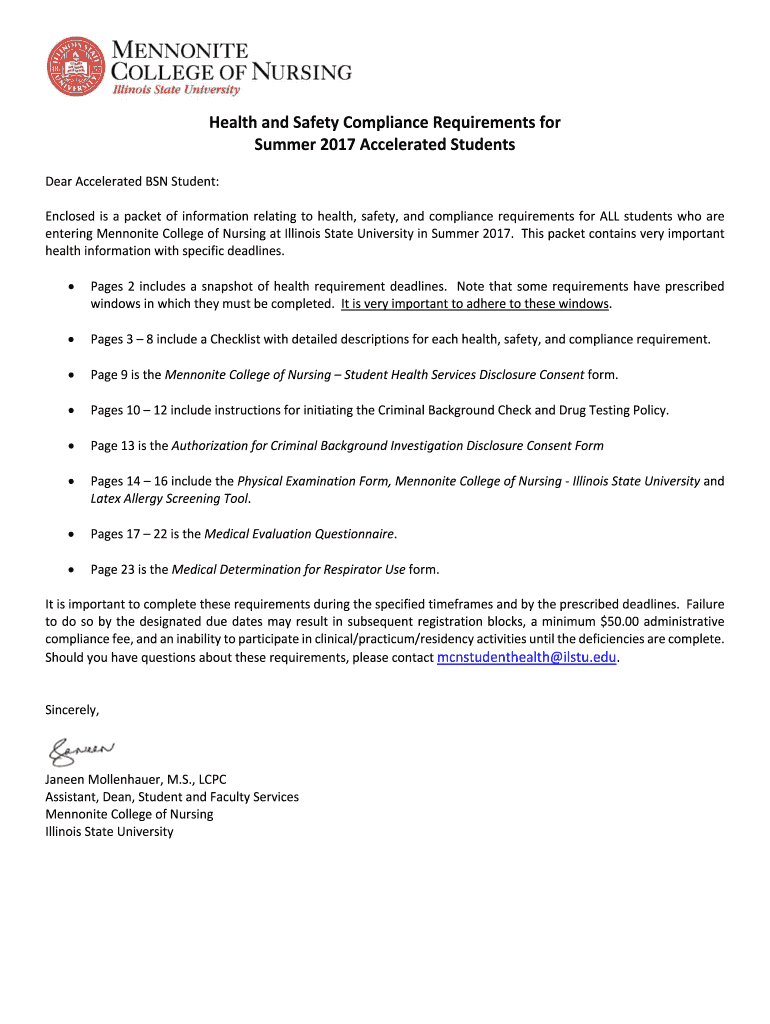 HealthandSafetyComplianceRequirementsfor Summer2017AcceleratedStudents DearAcceleratedBSNStudent: Enclosedisapacketofinformationrelatingtohealth, safety, and compliancerequirementsforALLstudentswhoare