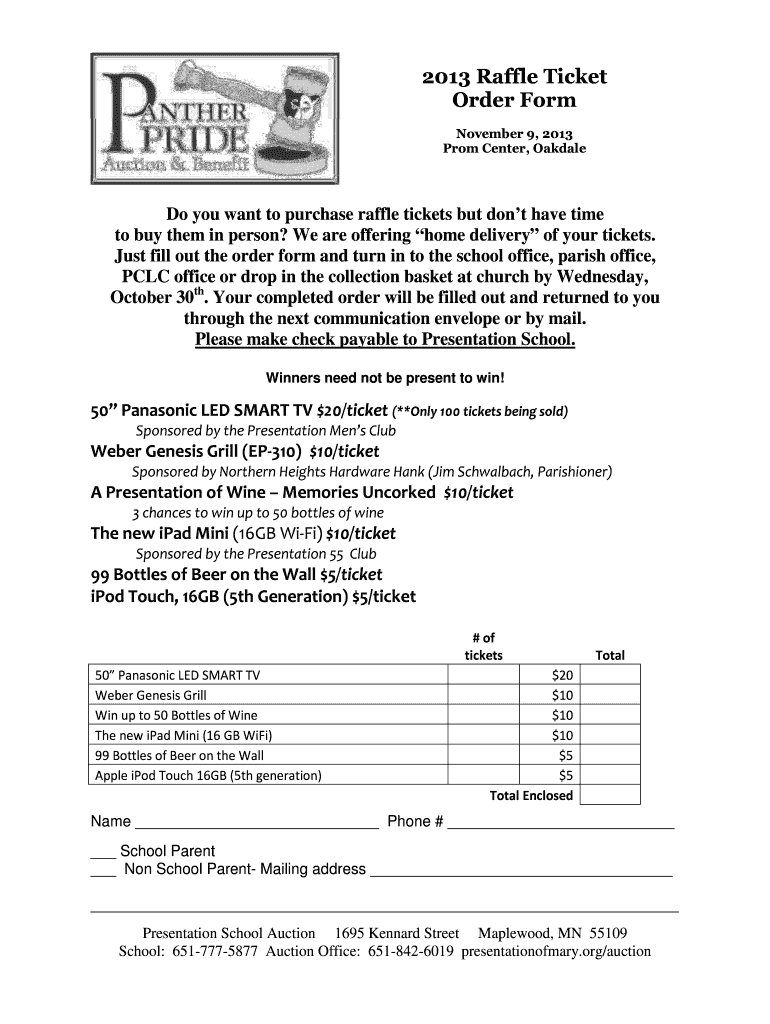 The auction raffle ticket order can be filled out online or by submitting a paper form with relevant ticket sale information.