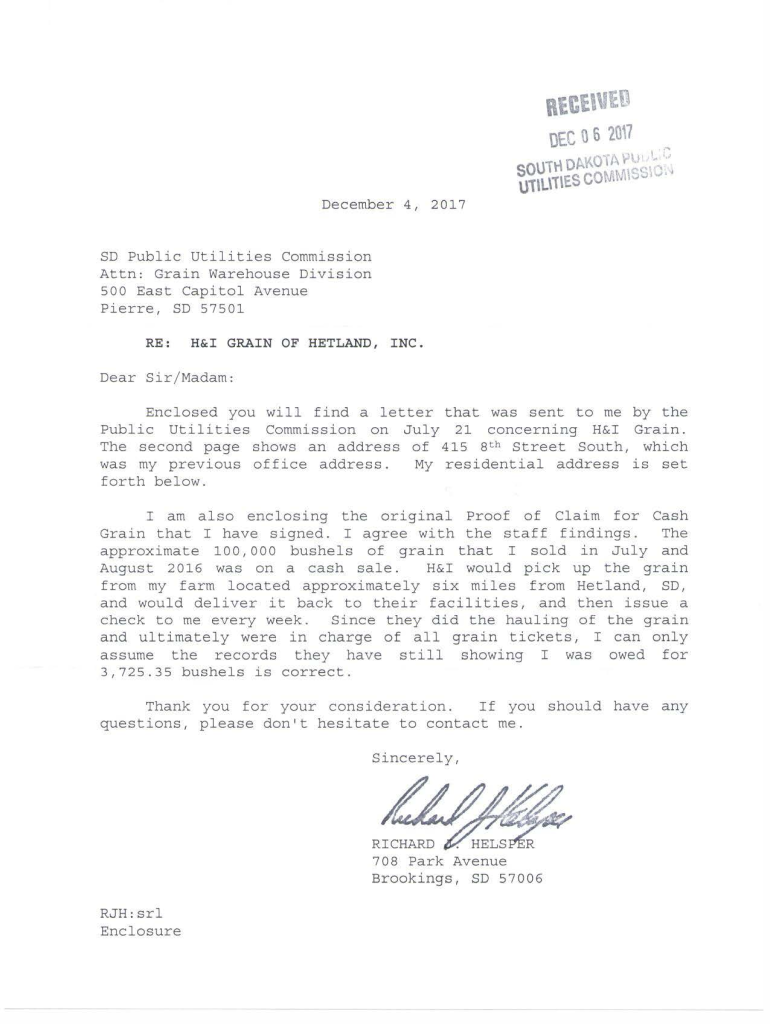 L&110 OEC o6 20 '7t. Korea VJ t scuttled commas. 'U 'Till December 4, 2017SD Public Utilities Commission Attn: Grain Warehouse Division 500 East Capitol Avenue Pierre, SD 57501 RE:H&I GRAIN OF WETLAND,