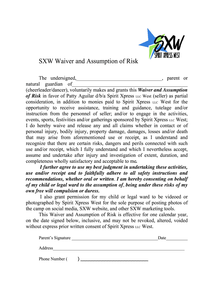 SAW Waiver and Assumption of Risk The undersigned, parent or natural guardian of (cheerleader/dancer), voluntarily makes and grants this Waiver and Assumption of Risk in favor of Patty Aguilar d/b/a