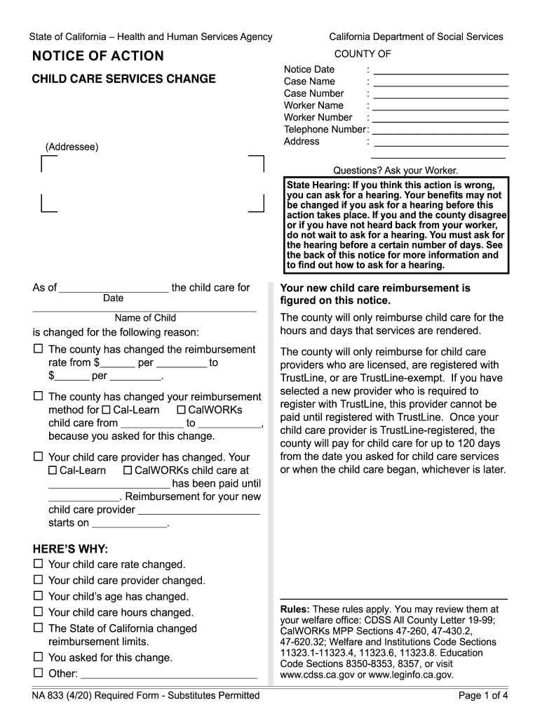 Get the free NA 833 (3/20) - Notice of Action - Child Care Services Change (Required Form - Subst...