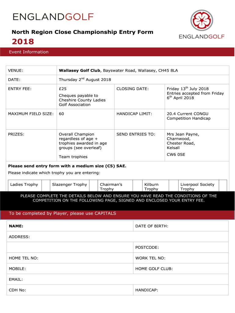 Get the free North Region Close Championship Entry Form 2018