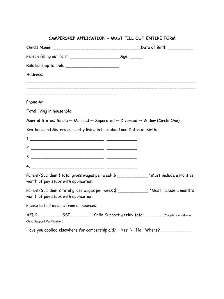 CAMPERS HIP APPLICATION MUST FILL OUT ENTIRE FORM Child's Name: Date of Birth: Person filling out form: Age: Relationship to child: Address: Phone #: Total living in household: Marital Status: Single