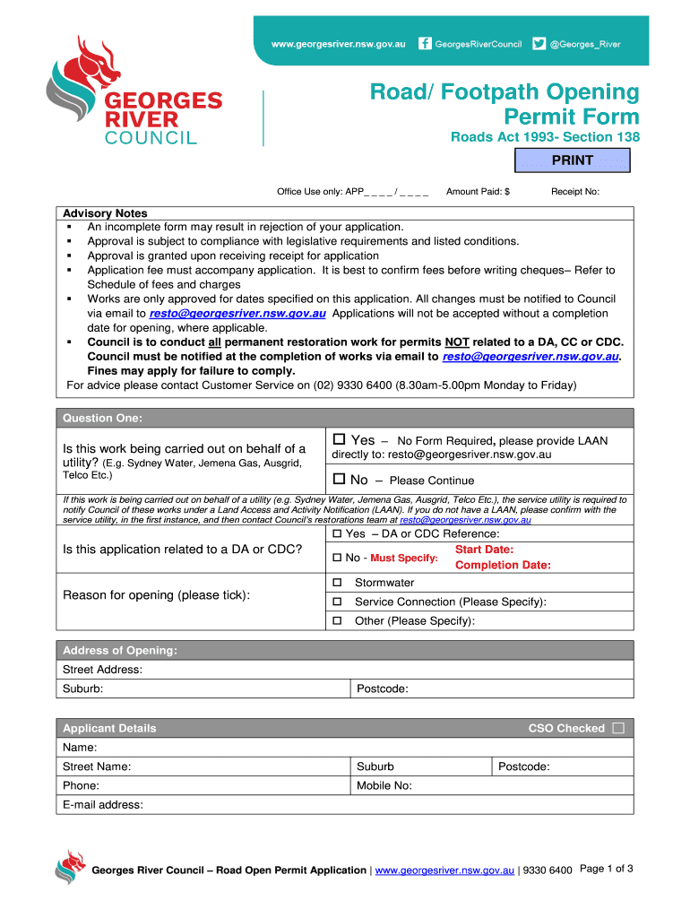 Get the free Road/ Footpath Opening Permit Form - Georges River Council