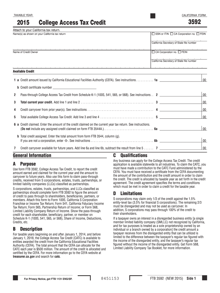 TAXABLE YEAR2015CALIFORNIA FORM3592College Access Tax CreditAttach to your California tax return. Name(s) as shown on your California tax return SSN or ITIN CA Corporation no. FEINCalifornia Secretary