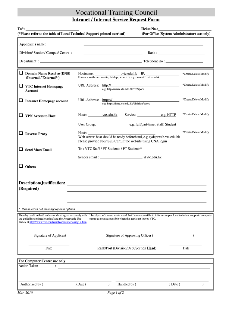 Vocational Training Council Intranet / Internet Service Request Form To*: (*Please refer to the table of Local Technical Support printed overleaf)Ticket No.: (For Office (System Administrator) use
