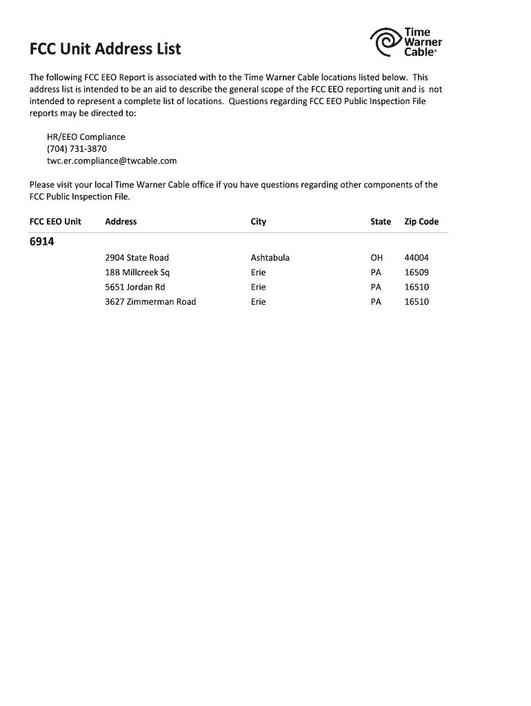 The following FCC EEO Report is associated with to the Time Warner Cable locations listed below. This