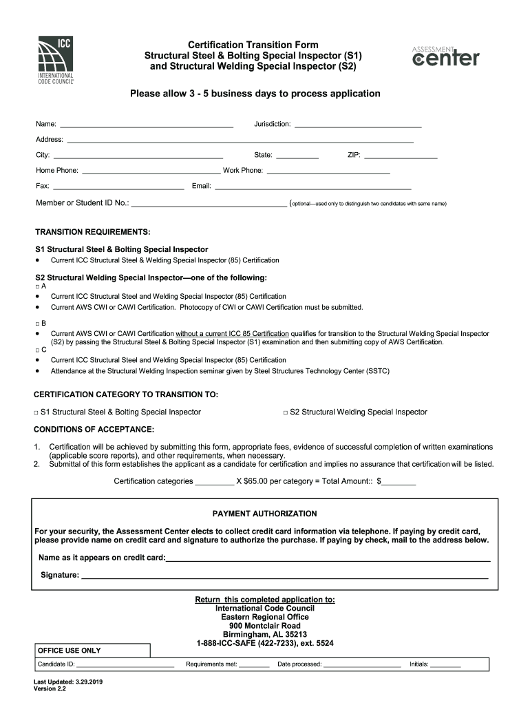 Certification Transition Form Structural Steel & Bolting Special Inspector (S1) and Structural Welding Special Inspector (S2) Please allow 3 5 business days to process application Name: Jurisdiction: