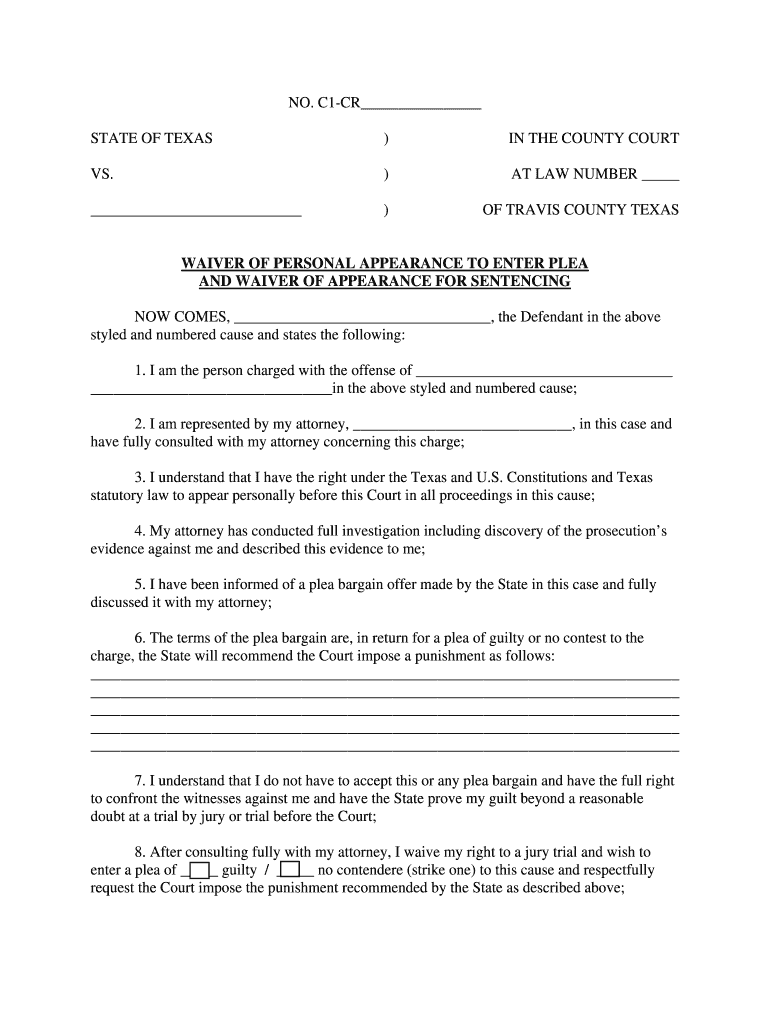 NO. C1CR STATE OF TEXAS)IN THE COUNTY COURTS.)AT LAW NUMBER)OF TRAVIS COUNTY TEXASWAIVER OF PERSONAL APPEARANCE TO ENTER PLEA AND WAIVER OF APPEARANCE FOR SENTENCING NOW COMES, the Defendant in the