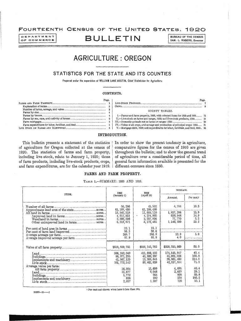F “OUR TEE:NTHCENSUSDEPARTMENT STATES NICE:OF THE:BULLETINCOMMERCE19 20BUREAU OF THE CENSUS SAM. L. ROGERS, DmeoTonAGRICULTURE OREGON STATISTICS FOR THE STATE AND ITS COUNTIES Prepared under the