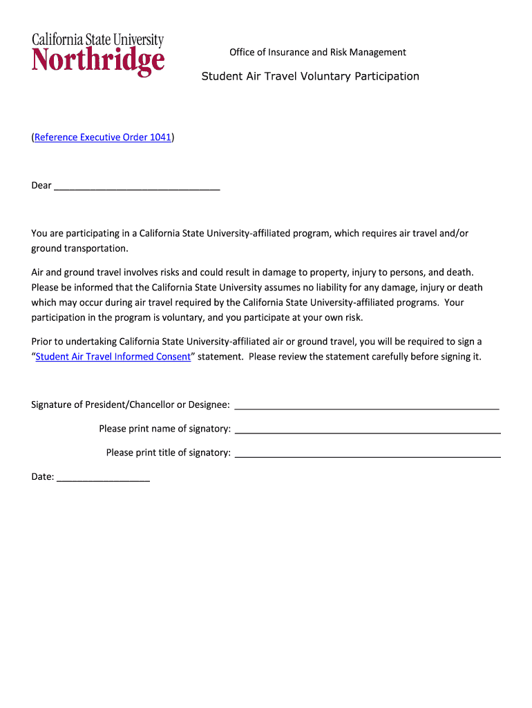 Office of Insurance and Risk Management Student Air Travel Voluntary Participation(Reference Executive Order 1041)Dear You are participating in a California State University affiliated program, which