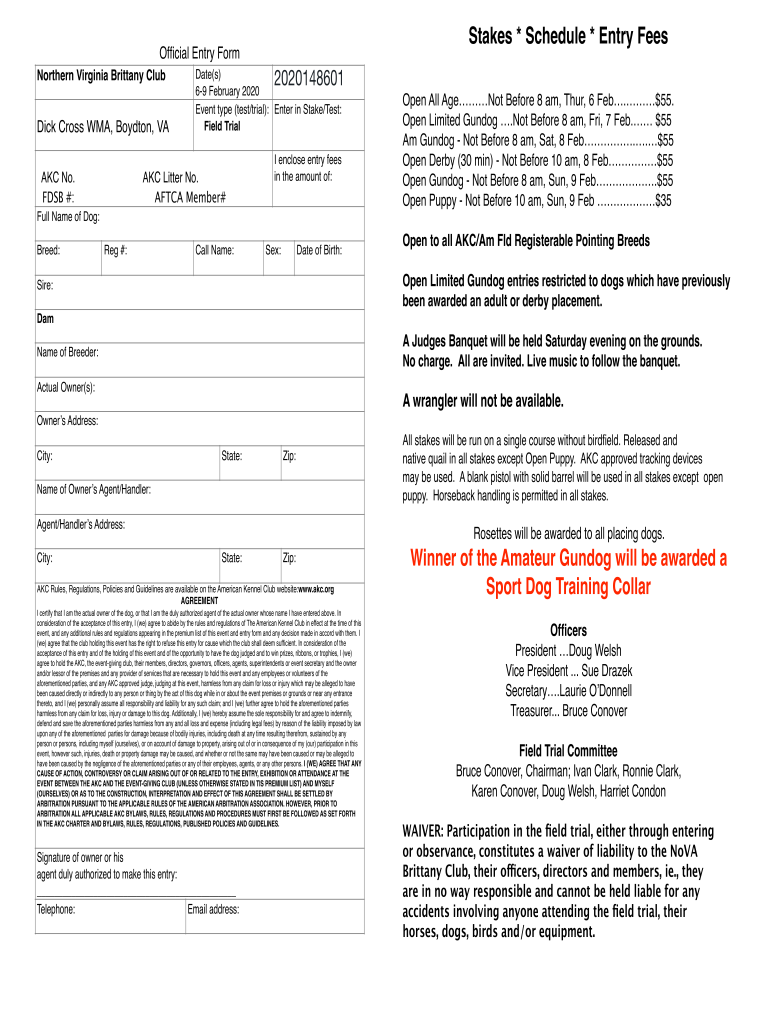 Stakes * Schedule * Entry Semiofficial Entry Form Northern Virginia Brittany Club Dick Cross MA, Boyd ton, VA AKC No. DSB #:2020148601Date(s) 69 February 2020 Event type (test/trial): Enter in Stake/Test: