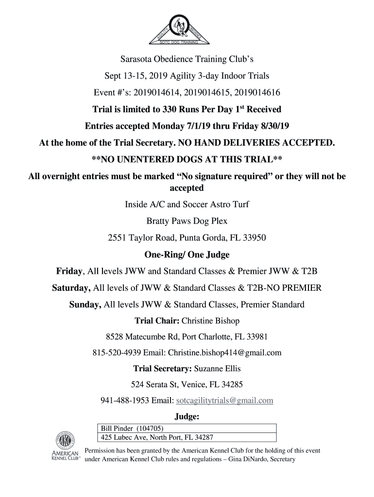 Sept 1315, 2019 Agility 3day Indoor Trials