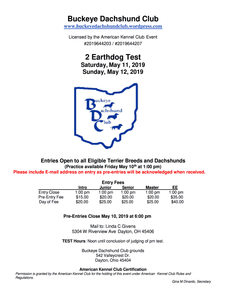 Get the free Buckeye Dachshund Club 2 Earthdog Test - American Kennel ...