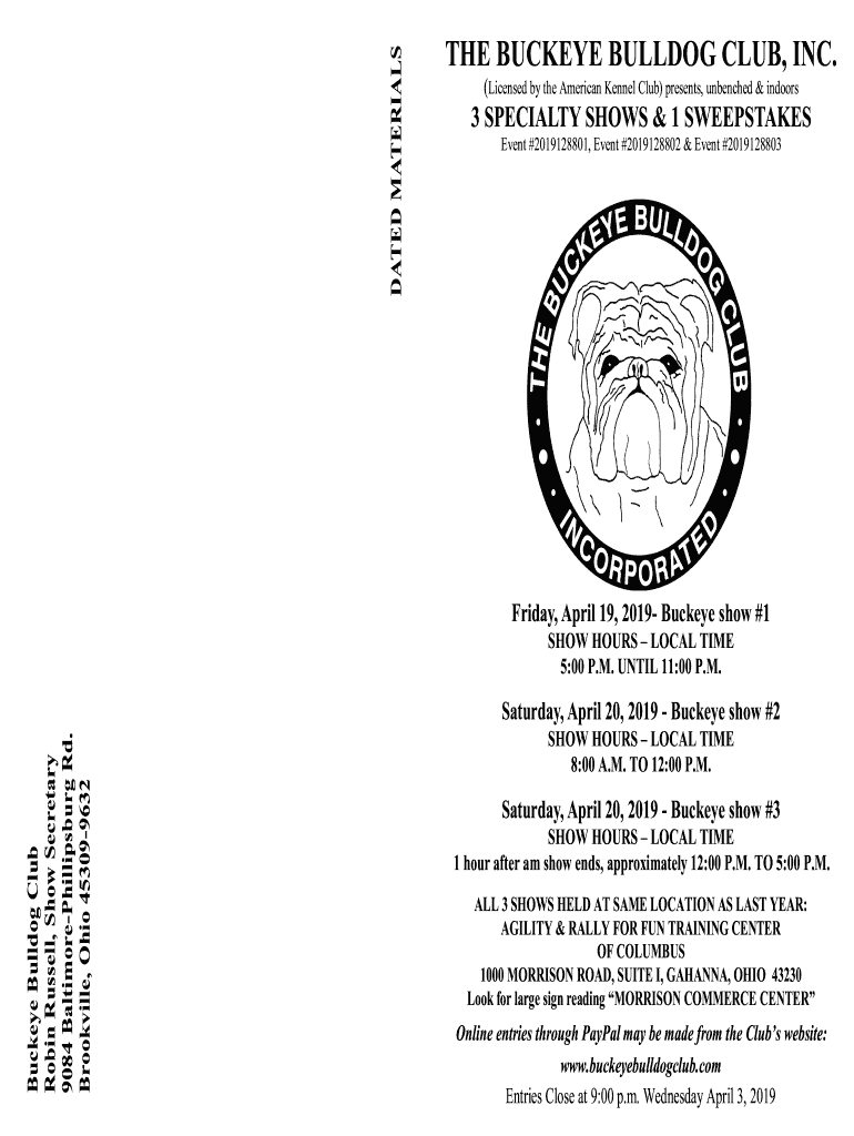 DATED MATERIALS BUCKEYE BULLDOG CLUB, INC. (Licensed by the American Kennel Club) presents, benched & indoors3 SPECIALTY SHOWS & 1 SWEEPSTAKES Event #2019128801, Event #2019128802 & Event #2019128803Friday,