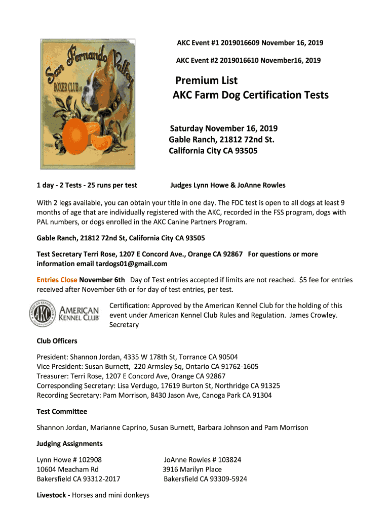 AKC Event #1 2019016609 November 16, 2019, AKC Event #2 2019016610 November16, 2019Premium List AKC Farm Dog Certification Tests Saturday, November 16, 2019, Gable Ranch, 21812 72nd St. California