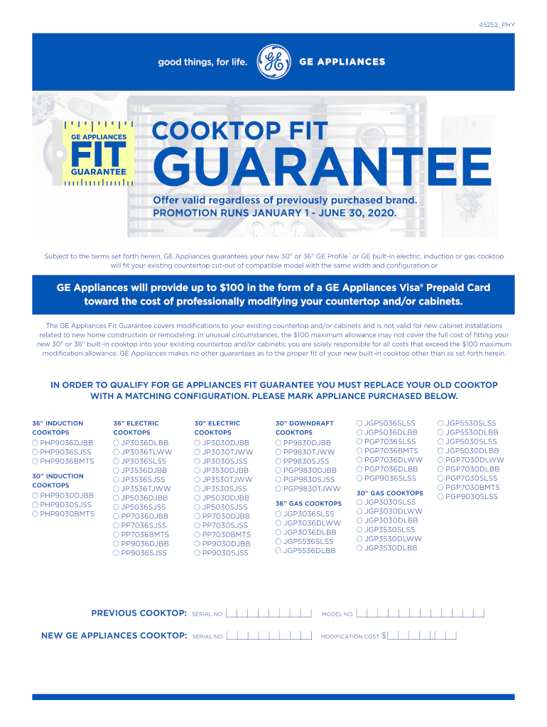 45252 PHYCOOKTOP GUARANTEE Offer valid regardless of previously purchased brand. PROMOTION RUNS JANUARY 1 JUNE 30, 2020. Subject to the terms set forth herein, GE Appliances guarantees your new 30