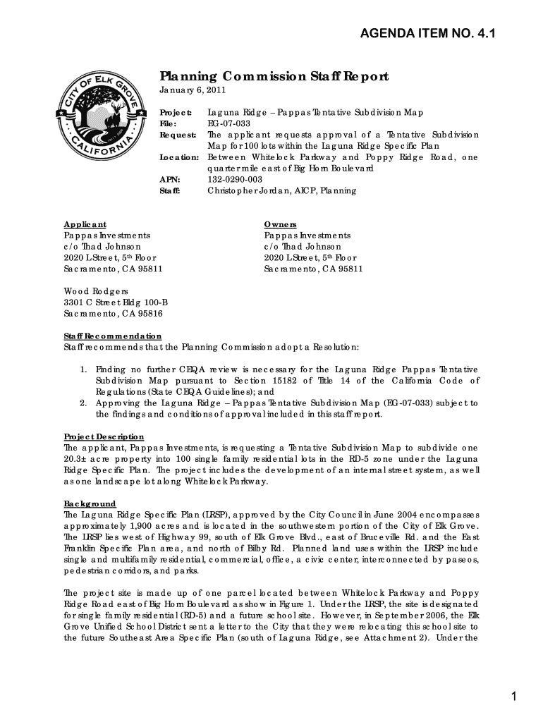 AGENDA ITEM NO. 4.1Planning Commission Staff Report January 6, 2011, Project: File: Request:Laguna Ridge Pampas Tentative Subdivision Map EG07033 The applicant requests approval of a Tentative Subdivision