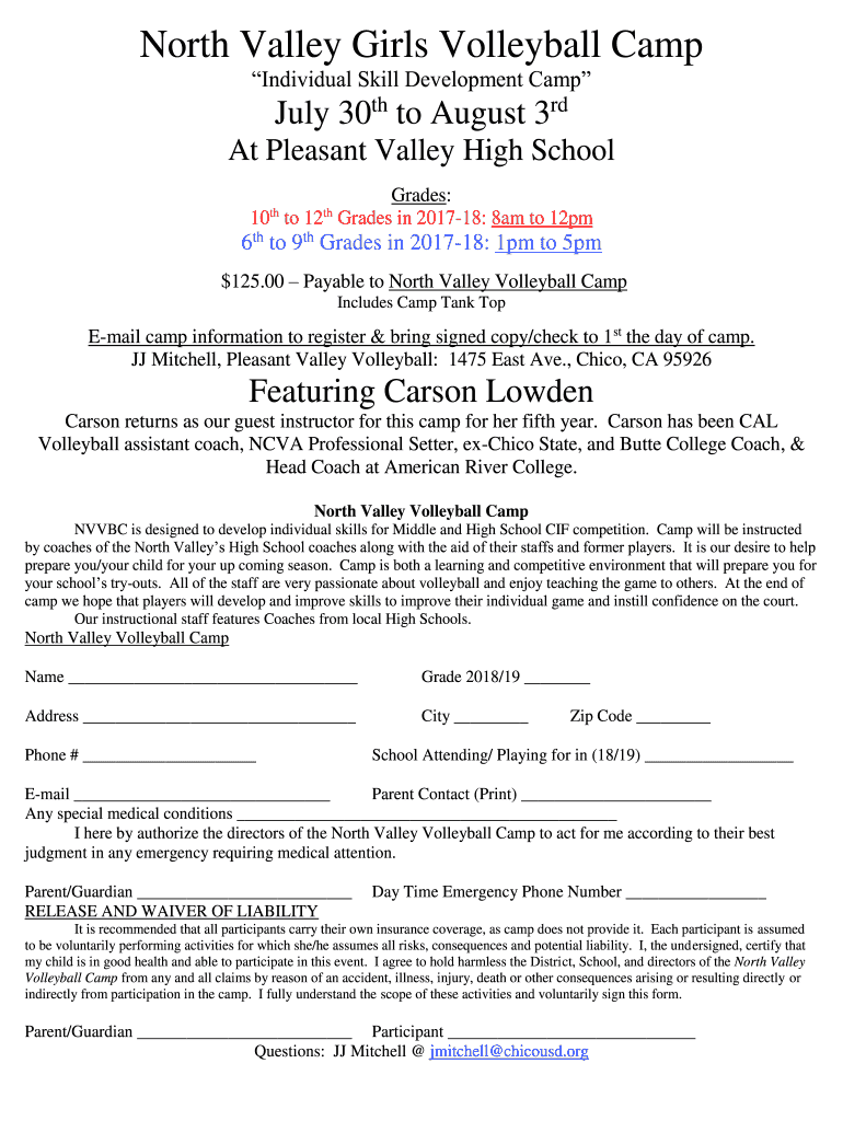 North Valley Girls Volleyball Camp Individual Skill Development Camp TH rd July 30 to August 3At Pleasant Valley High School Grades: 10 to 12 Grades in 201718: 8am to 12pm thth6th to 9th Grades in
